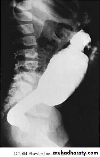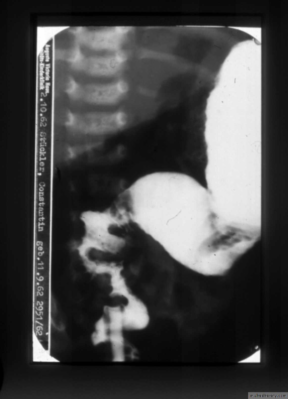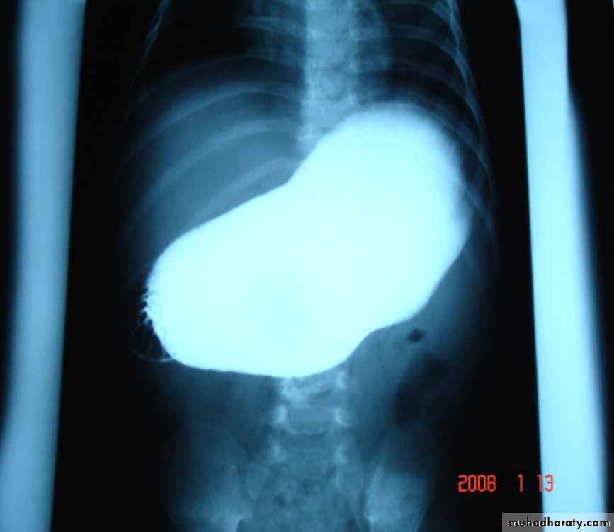 What is the differential diagnosis?Timing of operation?A 4 week old boy presents with vomiting. The pictures show the investigation and the operative findings.1. What is the diagnosis ?2. What is the investigation shown in slide A ?3. How do you treat ?4. What is the character and contents of vomitig in this pathology?5. What are the other methods of diagnosis?