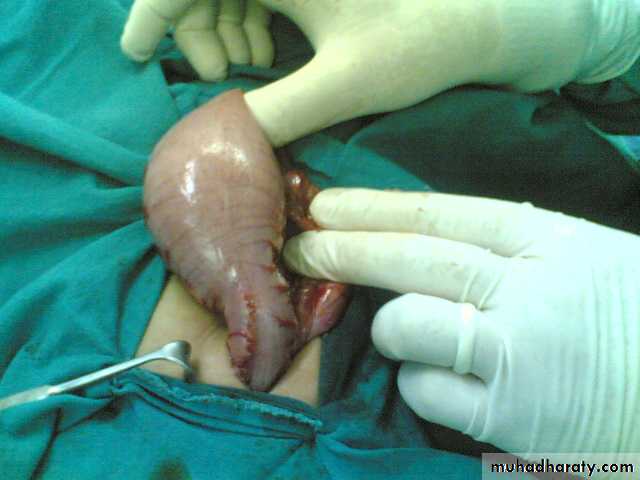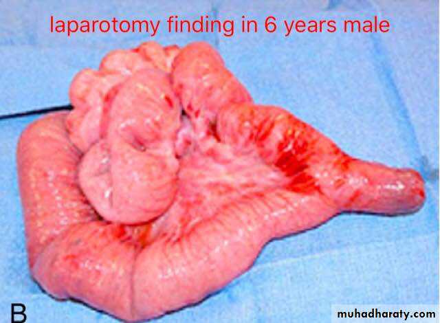 A 2 week old boy presents with history of constipation, abdominal distension and bilious vomiting. The pictures show the operative findings and radiographic investigation done for him.1. What is the diagnosis?2. What is the underlying pathology for this condition?3.Describe the findings in all slides.4. What other investigations used to reach the diagnosis?5. What are the steps of management for this condition?