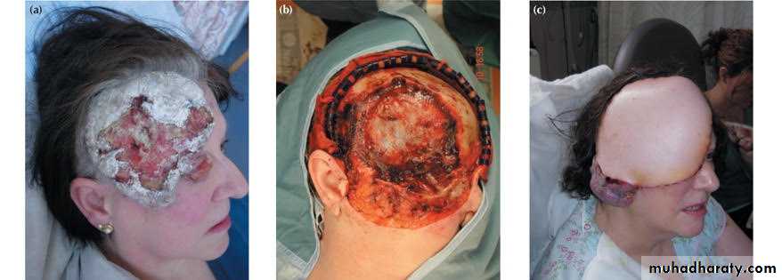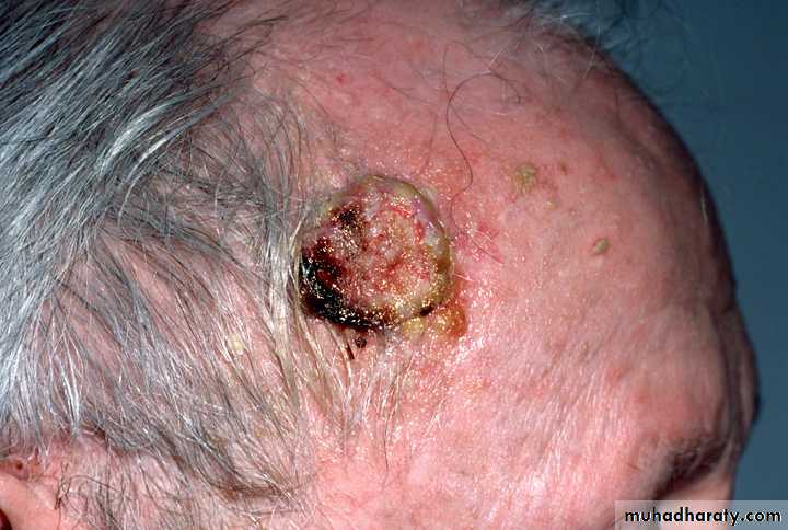 Treatment:Surgery: excision with 2-5 mm. healthy margin, & repair defect by skin graft or flap.