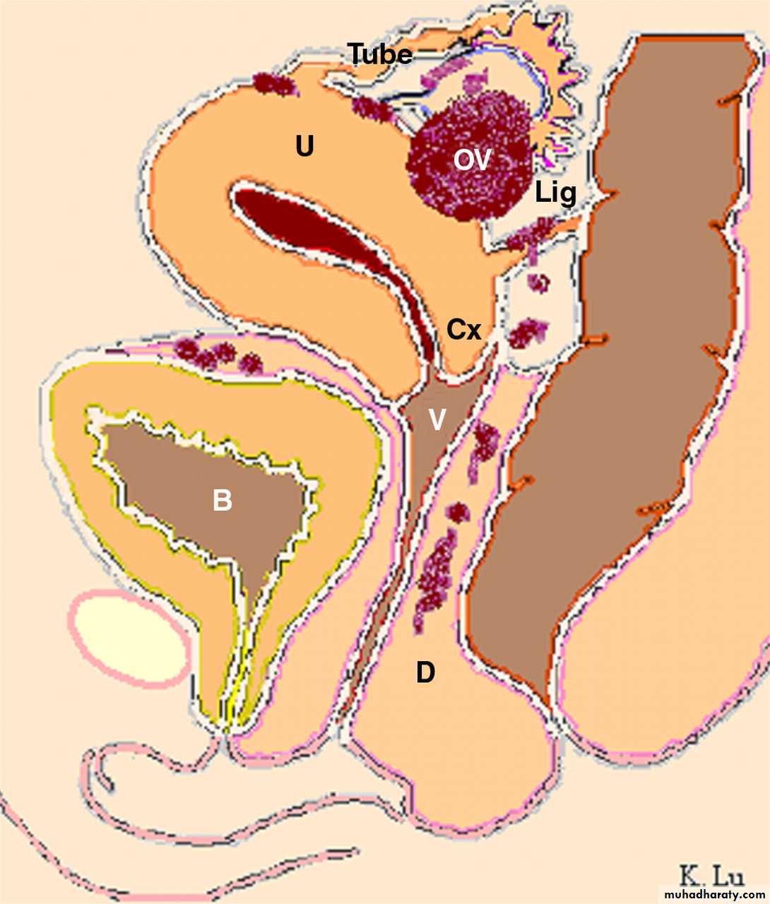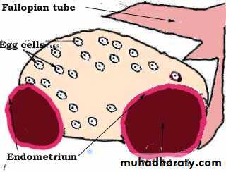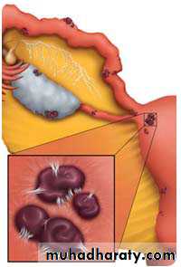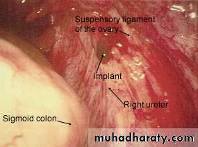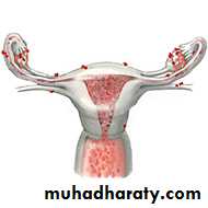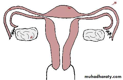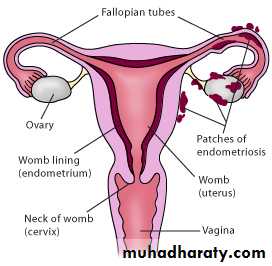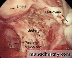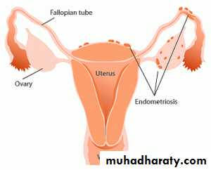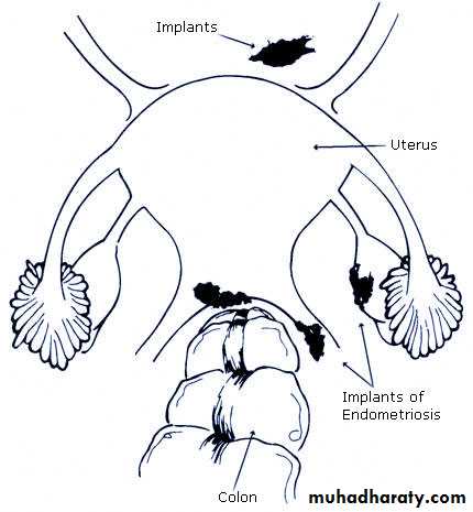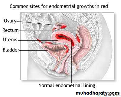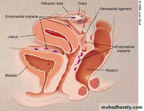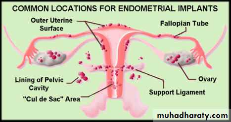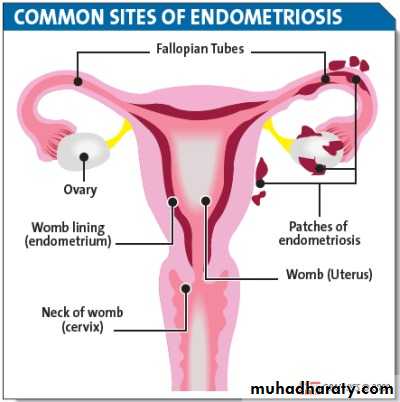 *Endometriosis lesions most commonly found in the pelvic cavity.on the surface of ovary, pelvic peritoneum, the fallopian tubes, on broad ligaments, the pelvic sidewall, uterosacral ligaments, the Pouch of Douglas, and in the rectal-vaginal septum.