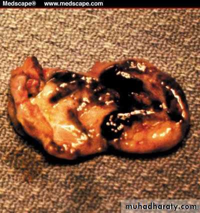 Hemorrhagic lesions overlying the right ureter.