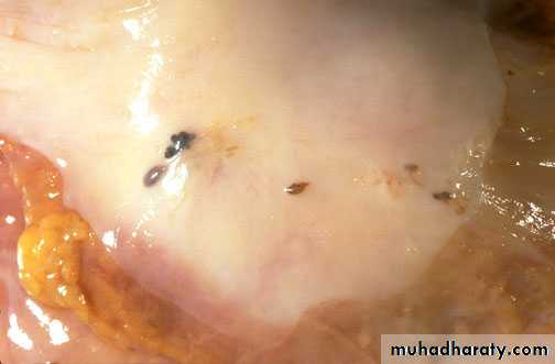 the gross appearance of "powder burns". Small foci are seen here just under the serosa of the posterior uterus in the pouch of Douglas.
