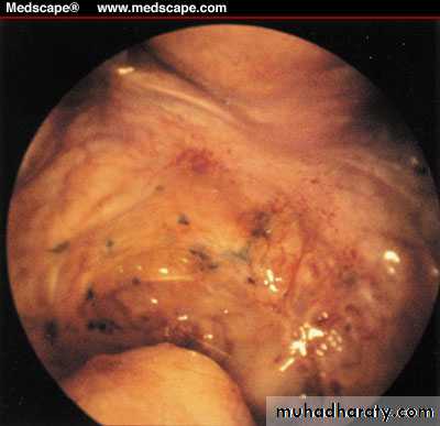 Endometriosis typically appears as superficial ‘powder-burn’ or ‘gunshot’ lesions, black, dark-brown or bluish puckered lesions, nodules or small cysts containing old haemorrhage surrounded by a variable extent of fibrosis on the ovaries, serosal surfaces and peritoneum.