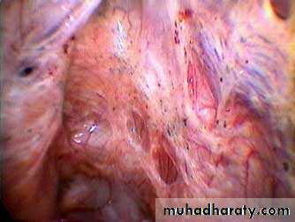 Extensive endometriosis in the ovarian fossa. Lesions have a petechial appearance.