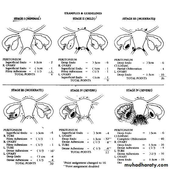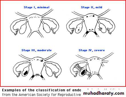 The 4 stages (classification) of endometriosis (minimal, mild, moderate or severe) are used to describe the anatomic location and the severity of the disorder.This system was designed to assist in the prognosis and management of patients undergoing surgery for infertility.Risk Factors for Endometriosis: