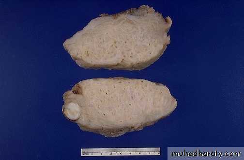 The thickened and spongy appearing myometrial wall of this sectioned uterus is typical of adenomyosis. There is also a small white leiomyoma at the lower left.