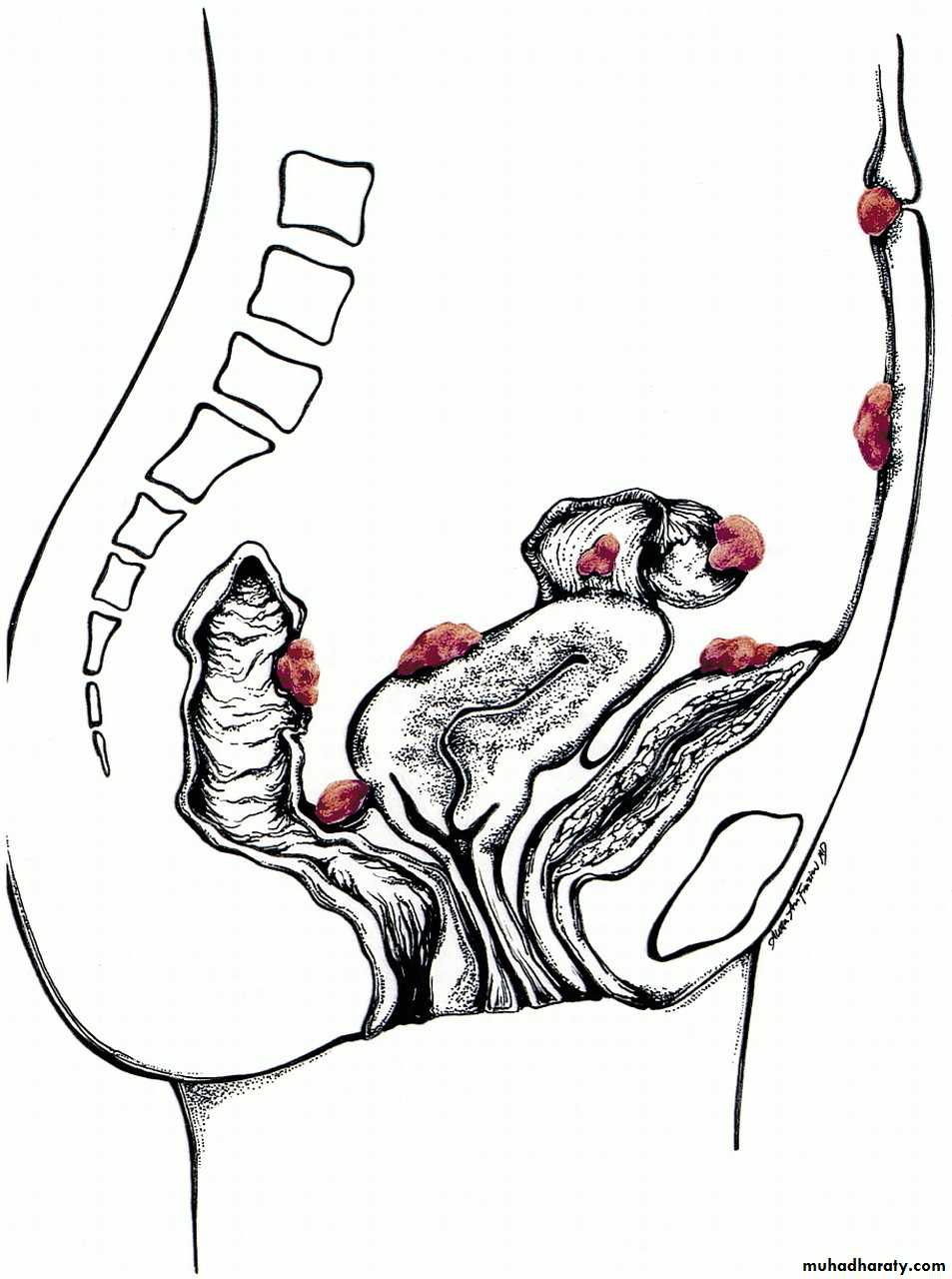 *a fixed retroverted uterus (In advanced and destructive disease).