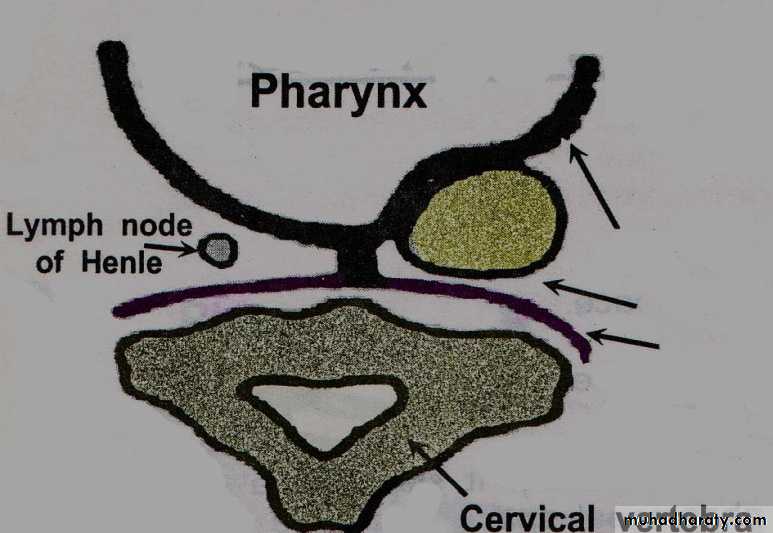 Site: at one side of the midline (The two fasciae are attached to each other at the midline by median raphe.)Aetiology: it is the result of suppuration of retropharyngeal lymph nodes ( LN of Rouviere) secondary to: