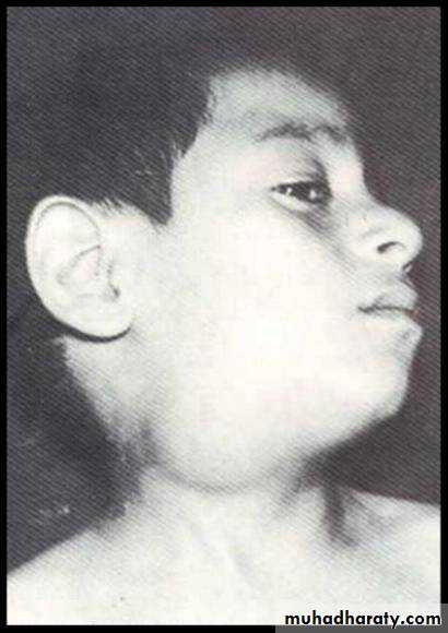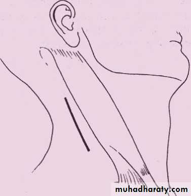 There is a unilateral diffuse tender swelling in the upper part of the neck, below & behind the angle of the mandible, deep to the anterior border of the sternomastoid. The neck is tilted to the diseases side.d) Trismus due to spasm of ptrygoid muscles.
