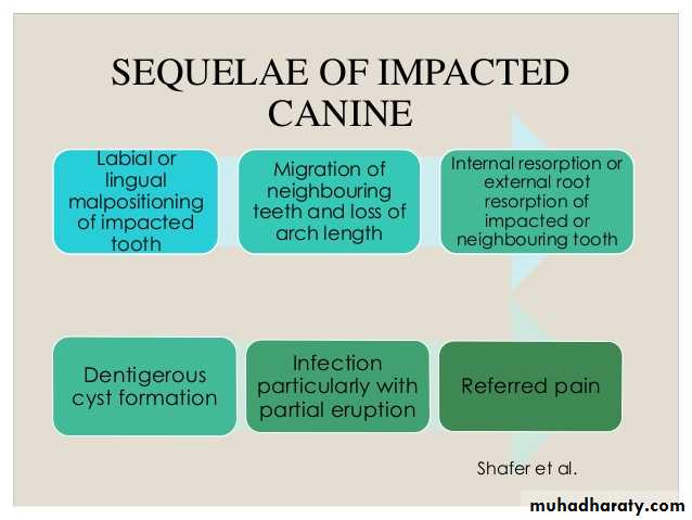 3.Canine cusp tip which is mesial to the midline of the lateral incisor, is more likely to be palatally impacted, and root resorptions are also more frequent.