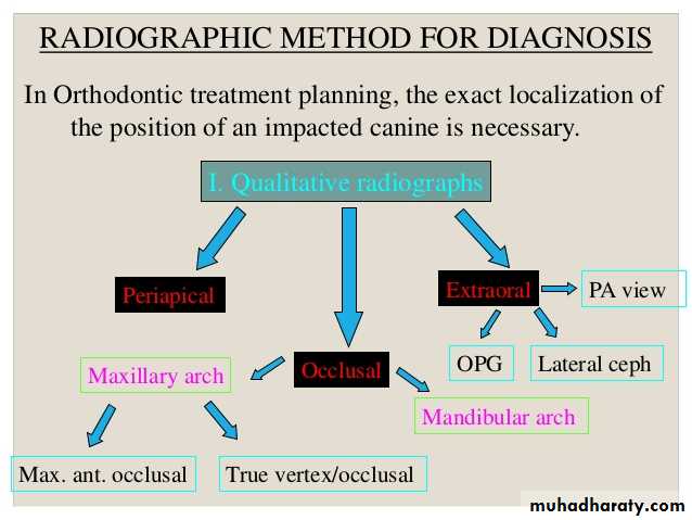 Lateral cephalometric radio graphs can help determine the position of impacted canines relative to other structures. They are helpful because they are some of the fundamental radiographs that all patients have taken prior to the beginning of orthodontic treatment. Maxillary canines can be located easily on this radiograph as early as age 8 or 9 years.