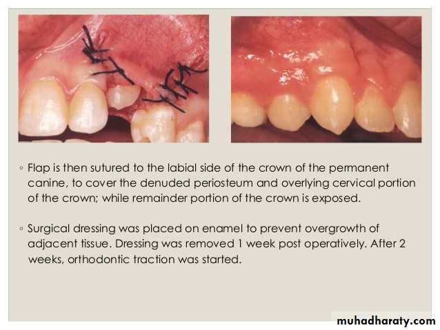 3.this technique had minimal effects on the periodontium and that the overall effects on the impacted canine appeared better than those from the closed exposure and early traction techniques.
