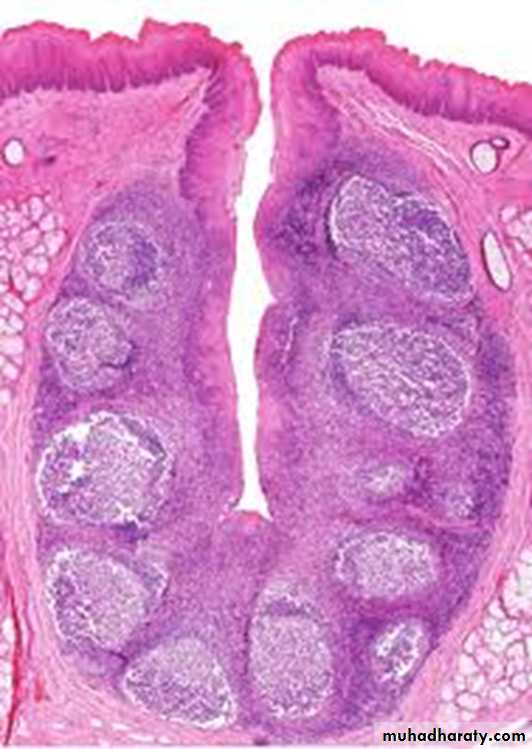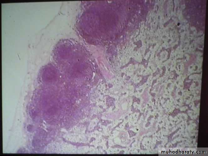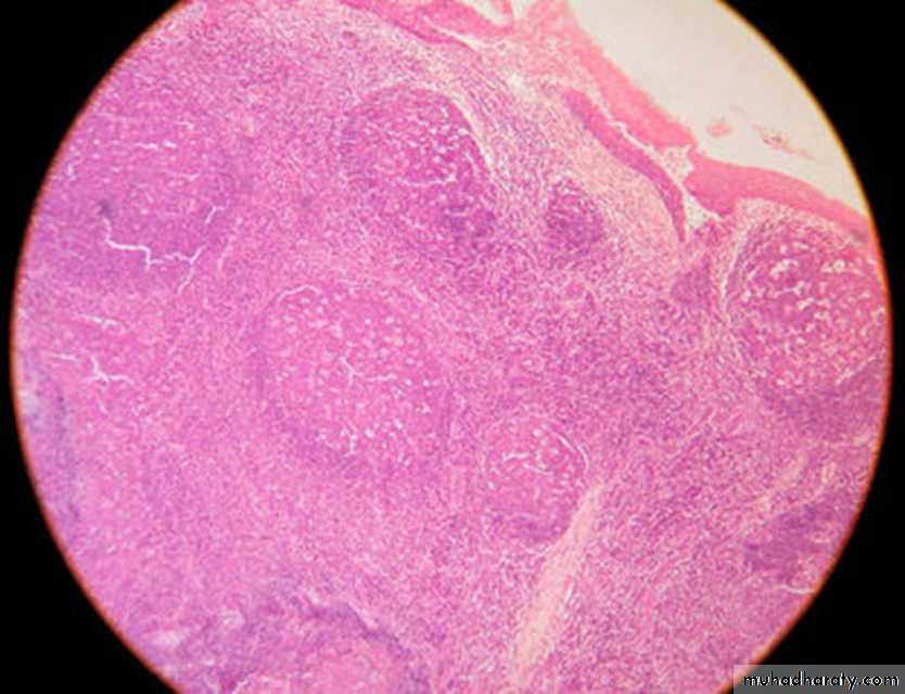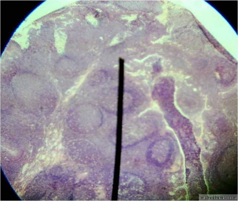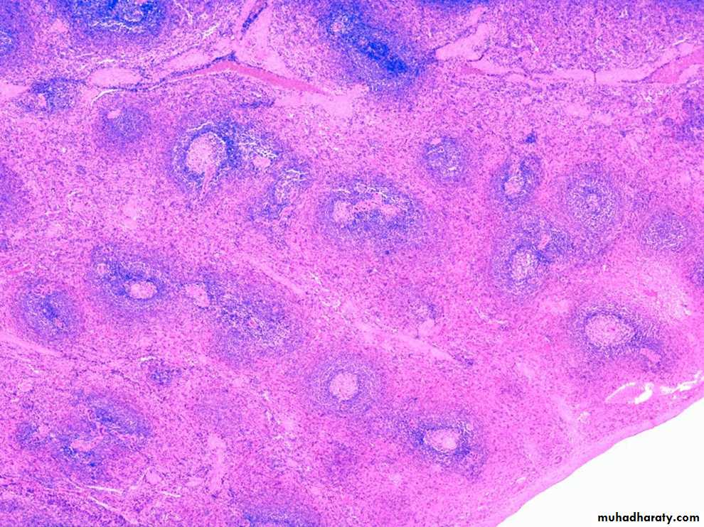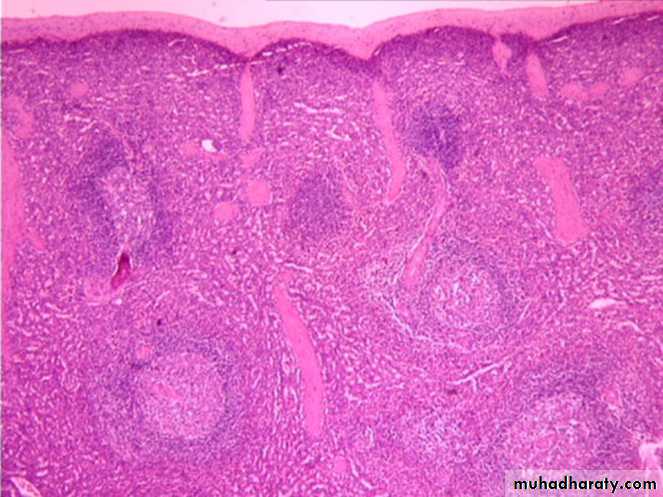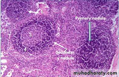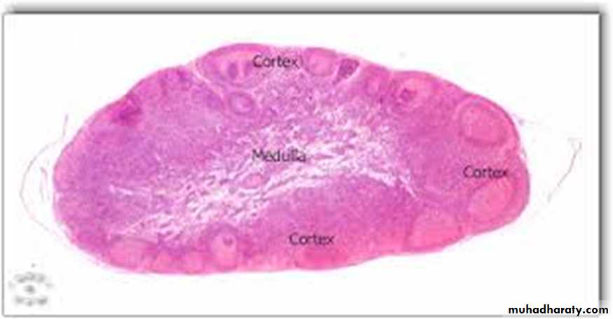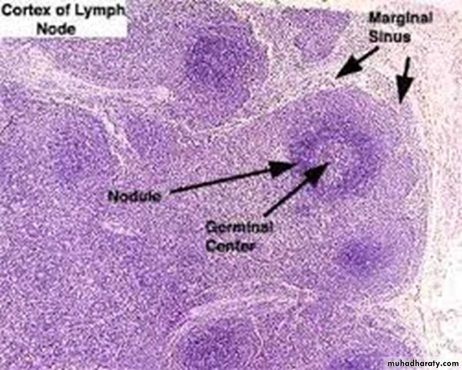 A-The outer cortex, situated under the capsule, consists of : 1. A diffuse population of cells composed mainly of T lymphocytes , Macrophages ,APCs reticular cells and reticular fibers and ground substance produced by the reticular cells. 2. Lymphoid nodules