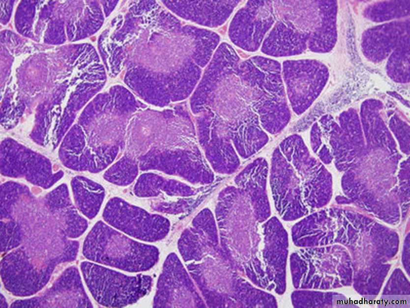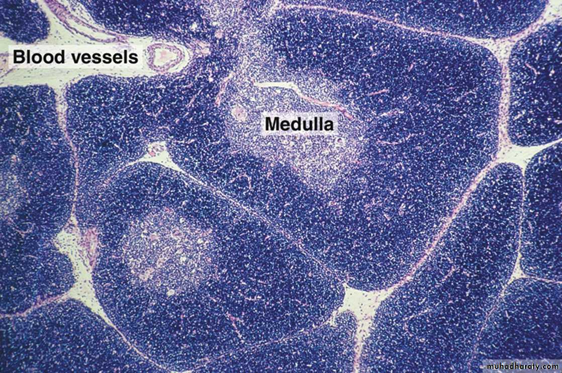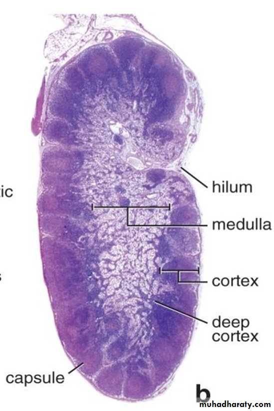 each lobule consist of outer deep zone( cortex) and inner pale zone ( medulla)