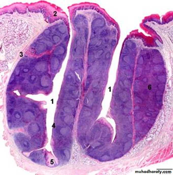 1- covered by stratified sequamous epithelium -2-Each tonsil has about 10-20 crypts3-composed of dense lymphoid tissue in a form of lymphatic nodules