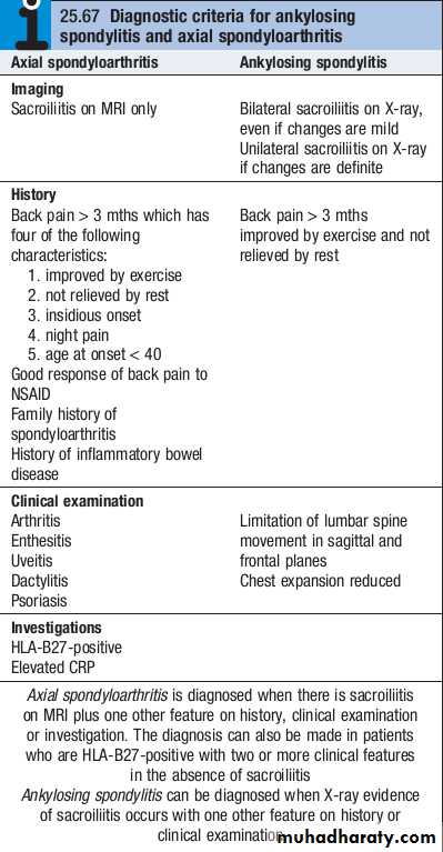 The ESR and CRP are usually raised in active disease but may be normal.Testing for HLAB27 can be helpful, especially in patients with back pain suggestive of an inflammatory cause, when other investigations have yielded equivocal results.