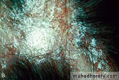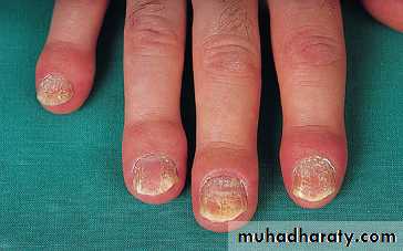 Nail changes include pitting, onycholysis, subungual hyperkeratosis and horizontal ridging. They are found in 85% of those with PsA and only 30% of those with uncomplicated psoriasis, and can occur in the absence of skin disease.The characteristic rash of psoriasis may be widespread, or confined to the scalp, natal cleft and umbilicus, where it is easily overlooked.