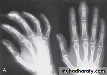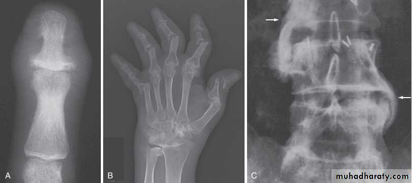Much of the hand deformity often results from tenosynovitis and soft tissue contractures.