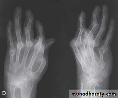 In chronic or recurrent disease, Xrays show periarticular osteoporosis, joint space narrowing and proliferative erosions.