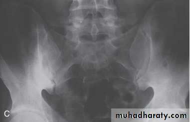 In established AS, radiographs of the sacroiliac joint show irregularity and loss of cortical margins, widening of the joint space and subsequently sclerosis, joint space narrowing and fusion.Lateral thoracolumbar spine Xrays may show anterior ‘squaring’ of vertebrae due to erosion and sclerosis of the anterior corners and periostitis of the waist.