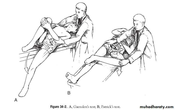 Patrick’s test.With the patient’s heel placed on the opposite knee, downward pressure on the flexed knee with the hip now in flexion, abduction, and external rotation (FABER) should elicit sacroiliac joint tenderness.