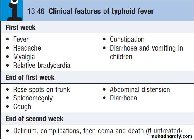 children diarrhoea and vomiting may be prominent early in the illness. The pulse is often slower than would be expected from the height of the temperature, i.e. a relative bradycardia.