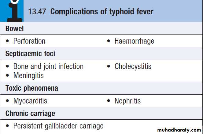 Haemorrhage from, or a perforation of, the ulcerated Peyer’s patches may occur at the end of the second or during the third week of the illness.A drop in temperature to normal or subnormal levels may be falsely reassuring in patients with intestinal haemorrhage.