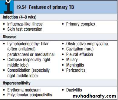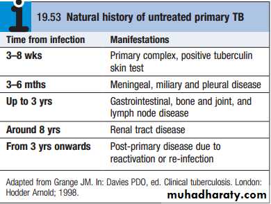 disease after primary infection is 10%, with roughly half of this risk occurring in the first 2 years after infection.Clinical features: pulmonary disease