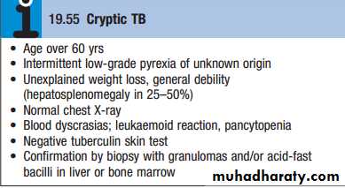 Blood-borne dissemination gives rise to miliary TB, which may present acutely but more frequently is characterised by 2–3 weeks of fever, night sweats, anorexia, weight loss and a dry cough. Hepatospleno megaly may develop and the presence of a headache may indicate coexistent tuberculous meningitis. Auscultation of the chest is frequently normal, but in more advanced disease, widespread crackles are evident. Fundoscopy may show choroidal tubercles. The classical appearances on chest X-ray are of fine 1–2 mm lesions (‘millet seed’) distributed throughout the lung fields, although occasionally the appearances are coarser. Anaemia and leucopenia reflect bone marrow involvement.‘Cryptic’ miliary TB is an unusual presentation sometimes seen in old age