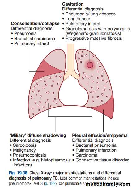 It is often difficult to distinguish active from quiescent disease on radiological criteria alone, but the presence of a miliary pattern or cavitation favours active disease. In extensive disease, collapse may be marked and results in significant displacement of the trachea and mediastinum. Occasionally, a caseous lymph node may drain into an adjoining bronchus, leading to tuberculous pneumonia.