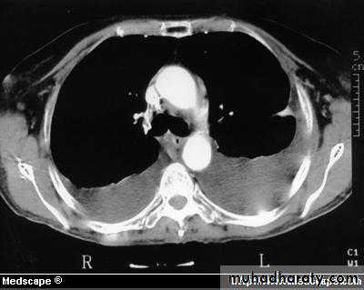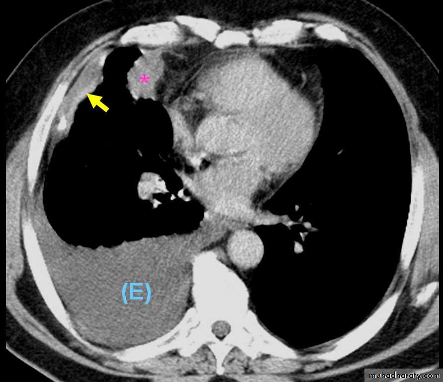 Computed tomography scan of the chest demonstrates a mass in the right upper lobe adjacent the pleura (*). Irregular soft-tissue thickening of the pleural surface (arrow) and pleural effusion (E) are present. The findings are most consistent with primary lung neoplasm with pleural metastasis and malignant pleural effusion. Results of thoracentesis were positive for malignant cells (adenocarcinoma).
