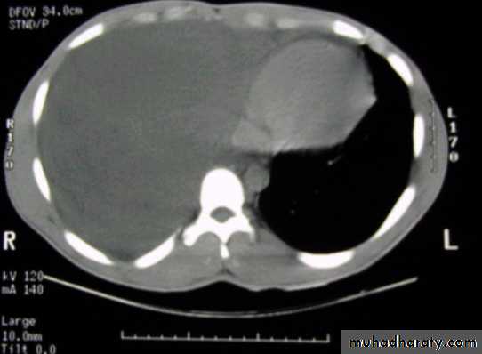 CT scan of chest showing that essentially the entire right lung volume is occupied by low attenuation fluid.