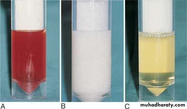 Pleural effusion. A, Blood-stained pleural aspirate. This patient had pleural metastases from carcinoma of the breast. B, Chylous pleural effusion. This patient had bronchial carcinoma that had invaded and obstructed the thoracic duct. C, Pleural transudate. This pale effusion is typically found in patients with heart failure or other causes of generalized edema