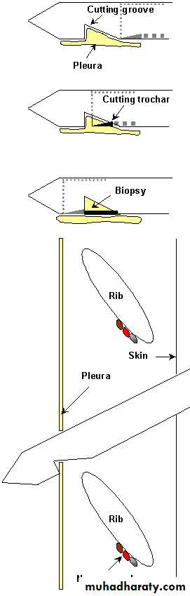 Biopsy is indicated to evaluate patients with an undiagnosed exudative effusion (particularly those with lymphocytic predominance) because the most frequently diagnosed disease is malignancy or tuberculosis.The procedure is performed under local anesthesia with a hook-type needle (Abrams needle).