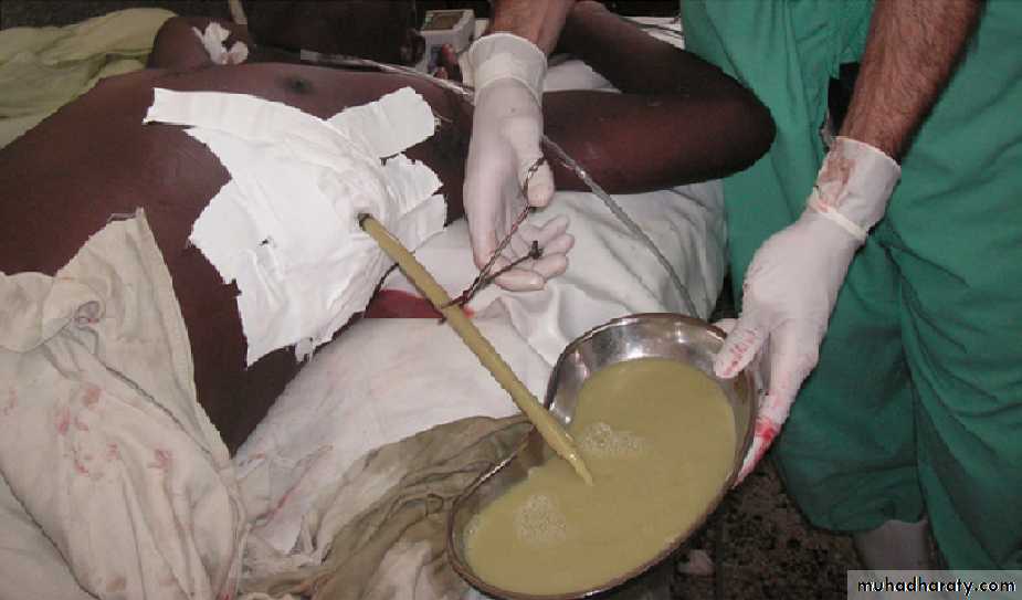 Turbid fluid or frank pus, or if loculations are seen on ultrasound, the tube should be put on suction (-5 to -10 cm H2O) and flushed regularly with 20 ml normal saline.