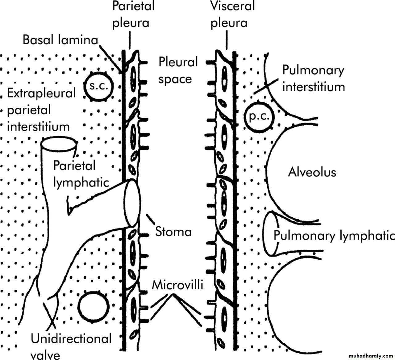 The pleura consists of mesothelial cells, connective and fibroelastic tissue, lymphatics, and vessels. The mesothelial cells are rich in microvilli, and their most important function is to deliver glycoproteins rich in hyaluronic acid to decrease friction between the lung and chest wall.