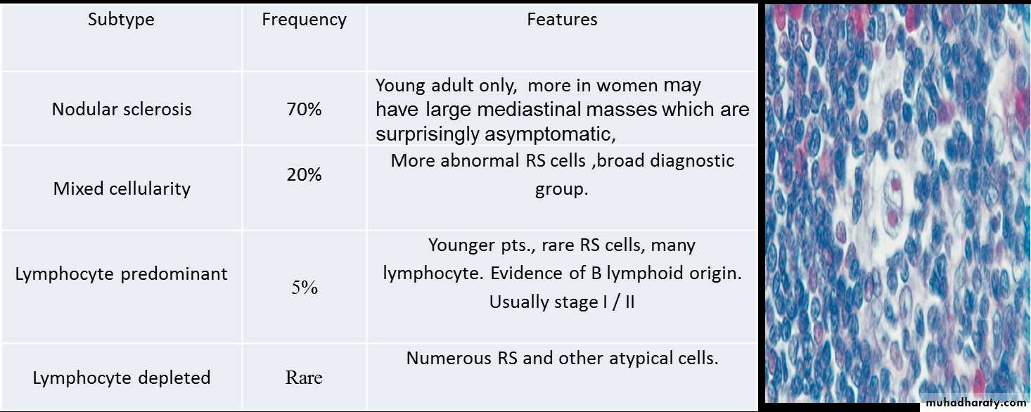 1- most pt present with one or several enlarge painless LN. cervical, inguinal and axillary's nods are most frequently involved. Hepatosplenomegaly may be present2- 1/5-1/3 of pt with intermediate and high grade lymphoma present in extra- nodal site such as waldeyers ring, GIT, skin, salivary gland, bone.
