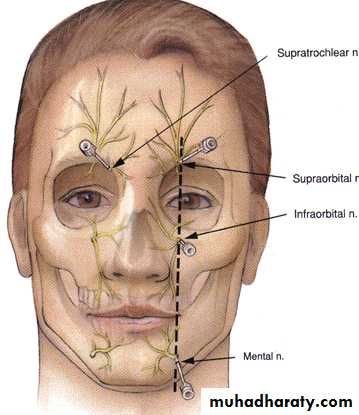 The skin of the face is supplied by branches of the three divisions of the trigeminal nerve , except for the small area over the angle of the mandible and the parotid gland which is supplied by the greater auricular nerve (C2 and 3) . These nerves not only supply the skin of face , but also supply proprioceptive fibers to the underlying muscles of facial expression .They are , in addition ,the sensory nerve supply to the mouth , teeth , nasal cavities, and paranasal air sinuses