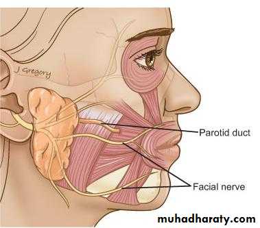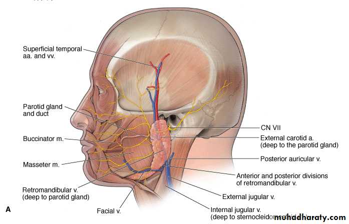 Lymph drainage: into the parotid & then into the deep cervical lymph nodes .