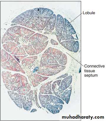 Thicker partitions of connective tissue (septa), continuous with the capsule and within which run the nerves and blood vessels supplying the gland, invest the excretory ducts and