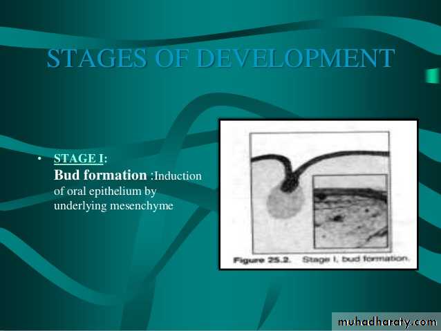 STAGE 1Bud formation: Just as for teeth, the individual salivary glands arise as a proliferation of oral epithelial cells, forming a focal thickening that grows into the underlying ectomesenchyme. Continued growth results in the formation of a small bud.