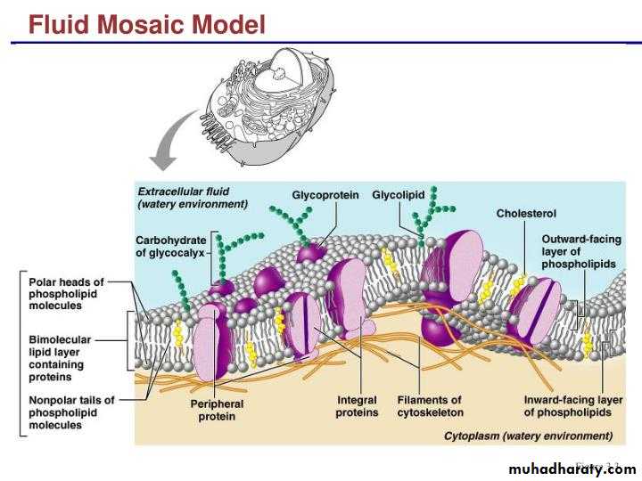 The most widely accepted model of plasma membrane structure is the fluid mosaic model of Singer & Nicolson (1972).The fluid mosaic model indicates that the cell membrane is not solid. It is flexible and has a similar consistency to vegetable oil, so all the individual molecules are just floating in a fluid medium, and they are all capable of moving sideways within the cell membrane. Mosaic refers to something that contains many different parts. The plasma membrane is a mosaic of phospholipids, cholesterol molecules, proteins and carbohydrates.