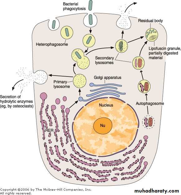 c- Autophagosomes: also called autophagic vacuoles or cytolysosomes. They contain some part of the cell in the process of digestion such as ER, mitochondria etc. digestion of these intracellular components is described as cellular autophagy.