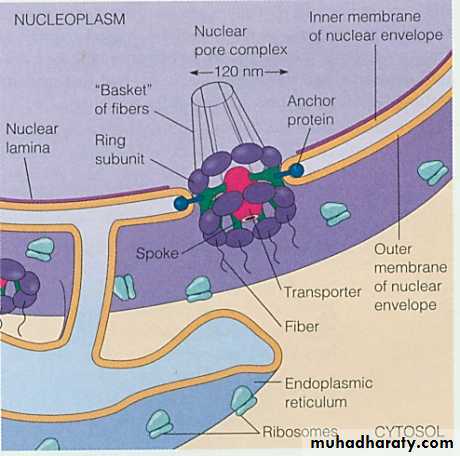 The envelope is perforated with tiny holes called nuclear pores. These pores regulate the passage of molecules between the nucleus and the cytoplasm.Detailed structural studies indicate that the nuclear pore complex consists of assembly of eight spokes arranged around a central channel.