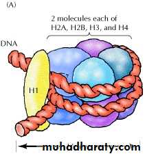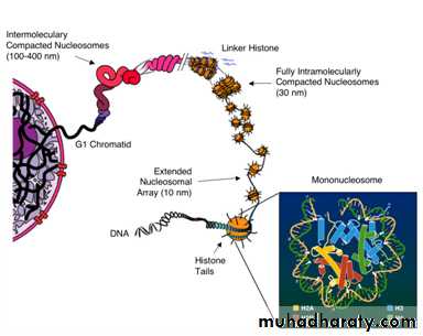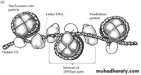 ( Chromatosome) consists of 166 base pairs of DNA wrapped around the histone core held by H1(a linker histone).Nonhistone proteins are major component of genetic regulatory system, acting as, activator, inhibitors and enzymes.