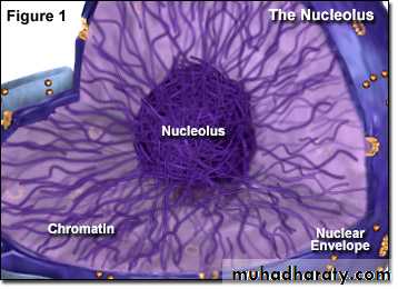 The Nucleus is a membrane-enclosed organelle found in eukaryotic cells. that serve as the information processing and administrative center of the cell. This organelle has two major functions: it stores the cells hereditary material, or DNA, and it coordinated the cells activities, which include growth, intermediary metabolism, protein synthesis, and reproduction (cell division). Its position may change from time to time according to the metabolic status of the cell. Usually the cells contain single nucleus., but a few cell types, such as mammalian red blood cells, have no nuclei, and a few others have many, but the number of nucleus may vary from cell to cell. On the basis of number of nuclei present, cells are classified as mononucleate(example;smooth muscle cell). Binucleate(example; liver cells, cartilage cells) and polynucleated cells(syncytial cells) (example; osteoclast).The shape of the nucleus normally related to the shape of the cell, but certain nuclei are almost irregular in shape. In a tumor, the presence of nuclei with irregular features (e.g., variable size, atypical chromatin patterns) and the capacity to invade neighboring tissues are the main morphologic characteristic used by pathologists to estimate the malignancy.The nucleus is the largest cellular organelle in animal cells. In mammalian cells, the average diameter of the nucleus is approximately 6 micrometres (µm), which occupies about 10% of the total cell volume. The viscous liquid within it is called nucleoplasm (or karyolymph), and is similar in composition to the cytosol found outside the nucleus. It appears as a dense, roughly spherical or irregular organelle. The composition by dry weight of the nucleus is approximately: DNA 9%, RNA 1%, Histone Protein 11%, Residual Protein 14%, Acidic Proteins 65%.