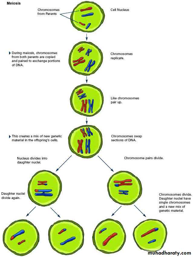 Meiosis is a process where a single cell divides twice to produce four cells containing half the original amount of genetic information. These cells are our sex cells – sperm in males, eggs in females.