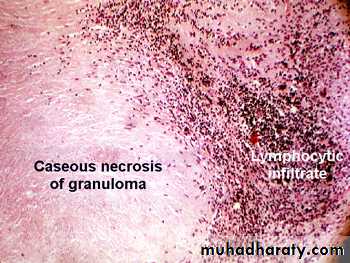 Microscopically the necrotic focus is composed of structureless amorphous granular debris enclosed within a ring of granulomatous inflammation.