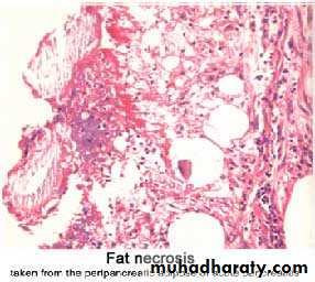 Most commenly seen in acute pancreatitis.“Refers to the necrosis in adipose tissue, induced by the