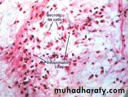 It occur following severe injury to the tissues with high fat content such as the breast, subcutaneous tissue and abdomen.Morphology